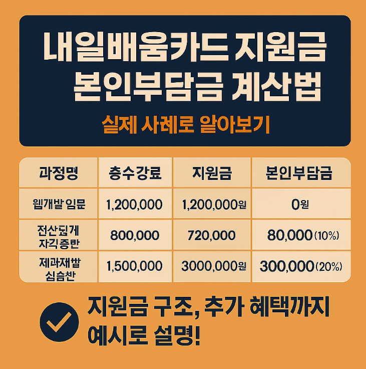 내일배움카드는 최대 500만원까지 훈련비를 지원해주는 제도인데요. 막상 신청하고 보면 “왜 본인부담금이 생기지?”, “어떤 과정은 무료고 어떤 건 유료야?” 이렇게 헷갈리는 경우가 많아요. 게다가 훈련장려금, 교통비, 식비 같은 추가 지원금도 있다 보니 도대체 얼마가 내 돈이고, 얼마가 나라 돈인지 감이 안 오는 경우도 많죠. 이번 글에서는 내일배움카드의 지원금 구조, 본인부담금 계산법과 추가 혜택까지 실제 예시로 알려드릴게요.