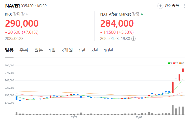 요즘 네이버 주가 흐름, 눈에 띄게 강한 상승세를 보이고 있어요. 2025년 6월 23일 기준으로 29만 원까지 올라왔고요, 불과 한 달 전만 해도 21만 원대였다는 걸 감안하면 꽤 가파른 오름세죠. 이 정도 상승이면 단순한 반등이라고 보기보다는, 시장의 강한 기대심리가 반영된 결과라고 할 수 있어요.