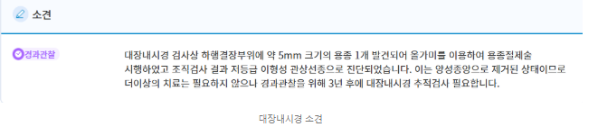 의사 선생님께서는 5mm 크기의 용종은 몇 달 만에 자라는 것이 아니라 몇 년에 걸쳐 자라는 것이기 때문에 앞으로는 대장내시경을 3년에 한 번씩 받아야 한다고 하셨습니다.
