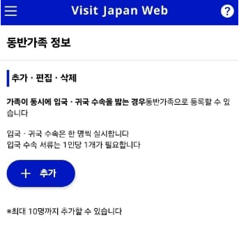 - 동반가족 등록: 동반가족 정보에서 ‘추가’를 선택한 후 여권 정보를 입력하면 완료됩니다.