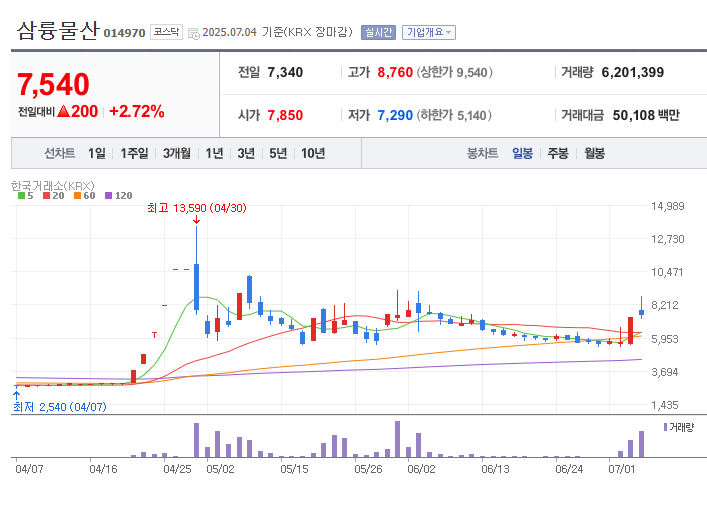 2025년 6월 말 거래 재개 이후 극단적인 주가 움직임이 나타났습니다. 7월 4일 기준 종가는 7,540원이며, 거래량은 무려 620만 주를 넘었어요.