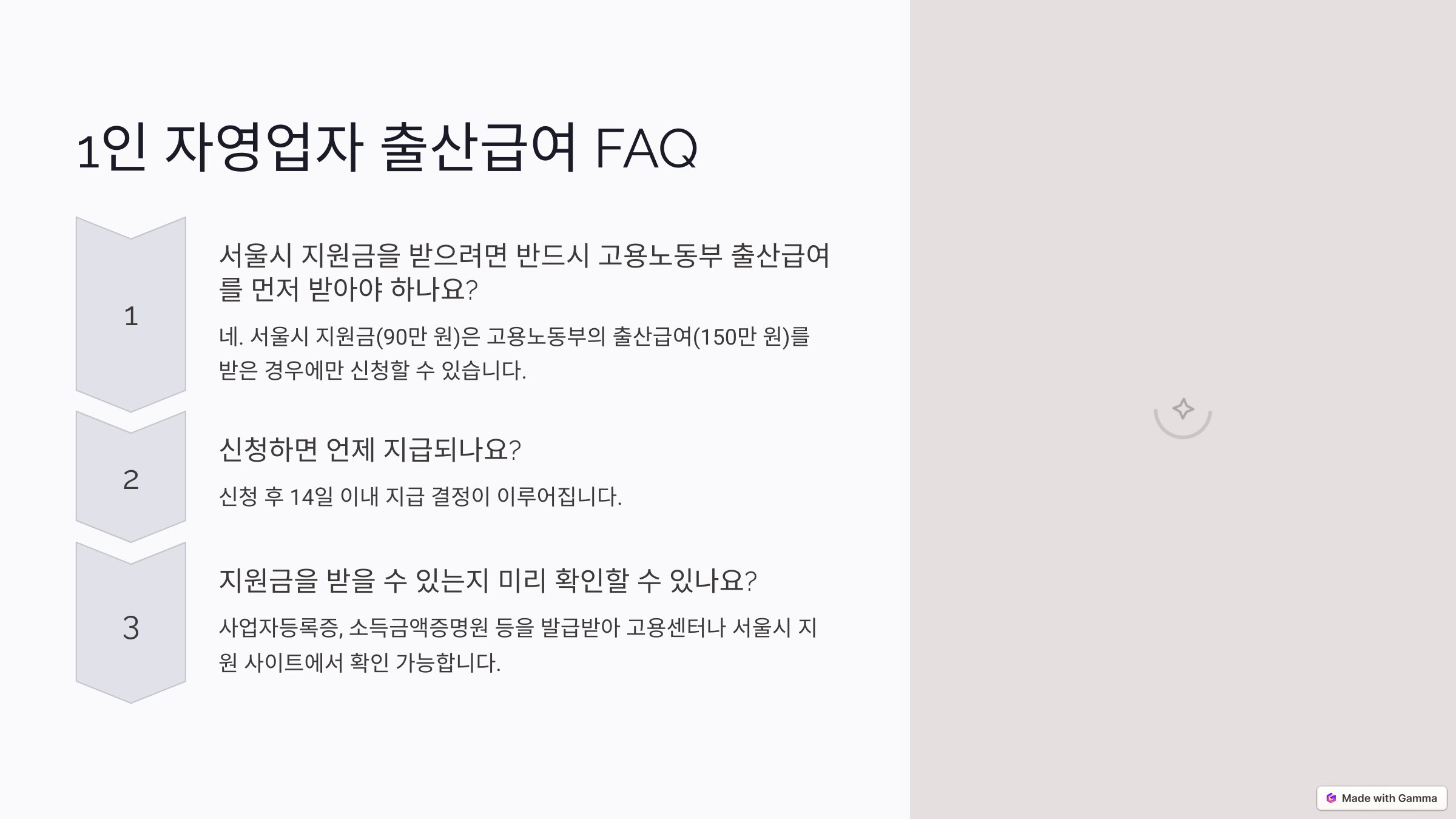 👉 네. 서울시 지원금(90만 원)은 고용노동부의 출산급여(150만 원)를 받은 경우에만 신청할 수 있습니다.