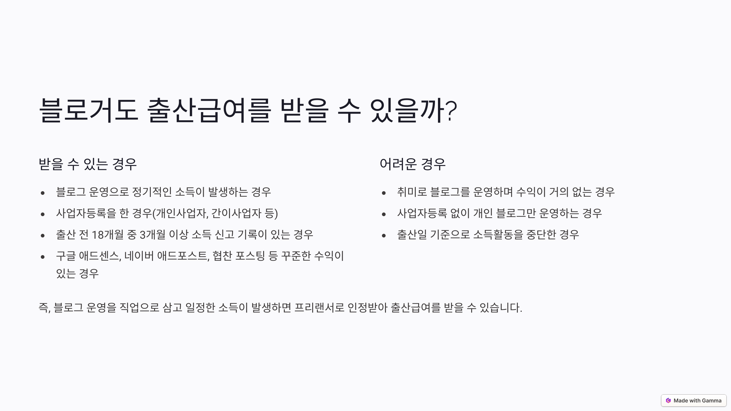 💡 즉, 블로그 운영을 직업으로 삼고 일정한 소득이 발생하면 프리랜서로 인정받아 출산급여를 받을 수 있습니다.