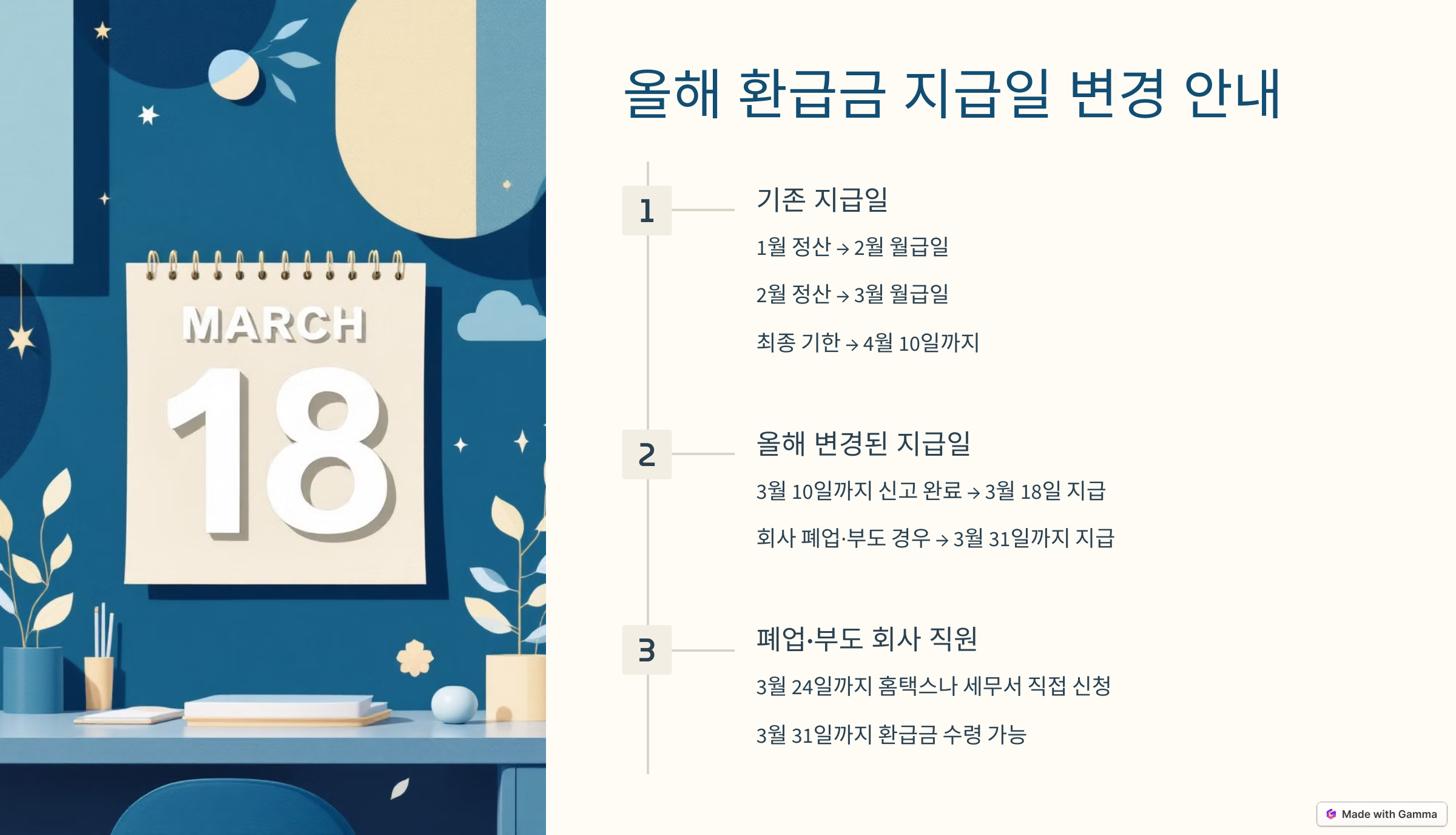 올해 연말정산 환급금 지급일이 3월 18일로 앞당겨졌습니다. 따라서 3월 10일까지 연말정산을 완료하면 더 빨리 받을 수 있습니다.