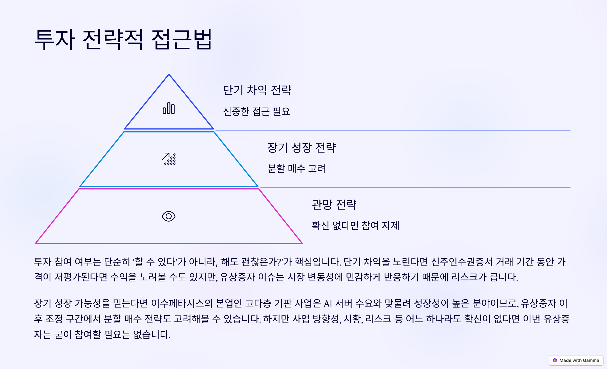 이번 이수페타시스 유상증자는 기회가 될 수도, 리스크가 될 수도 있습니다. 중요한 건 '남들이 다 한다고 해서' 참여하는 것이 아니라, 내 투자 원칙과 기준에 맞는 전략을 세우는 것입니다.정보는 충분히 나와 있습니다. 핵심은 그것을 어떻게 해석하고, 어떻게 판단할 것인가이니, 다들 투자전략 잘 세유시기 바랍니다.
