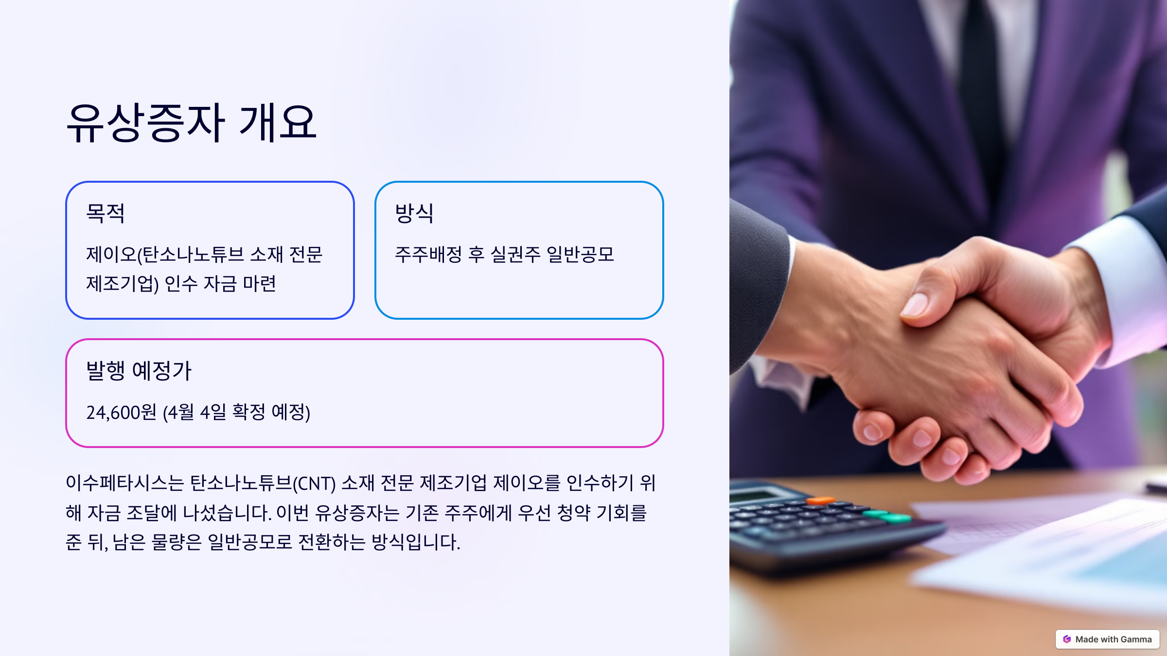 이수페타시스는 탄소나노튜브(CNT) 소재 전문 제조기업 제이오를 인수하기 위해 자금 조달에 나섰습니다. 이번 유상증자는 기존 주주에게 우선 청약 기회를 준 뒤, 남은 물량은 일반공모로 전환하는 방식입니다.