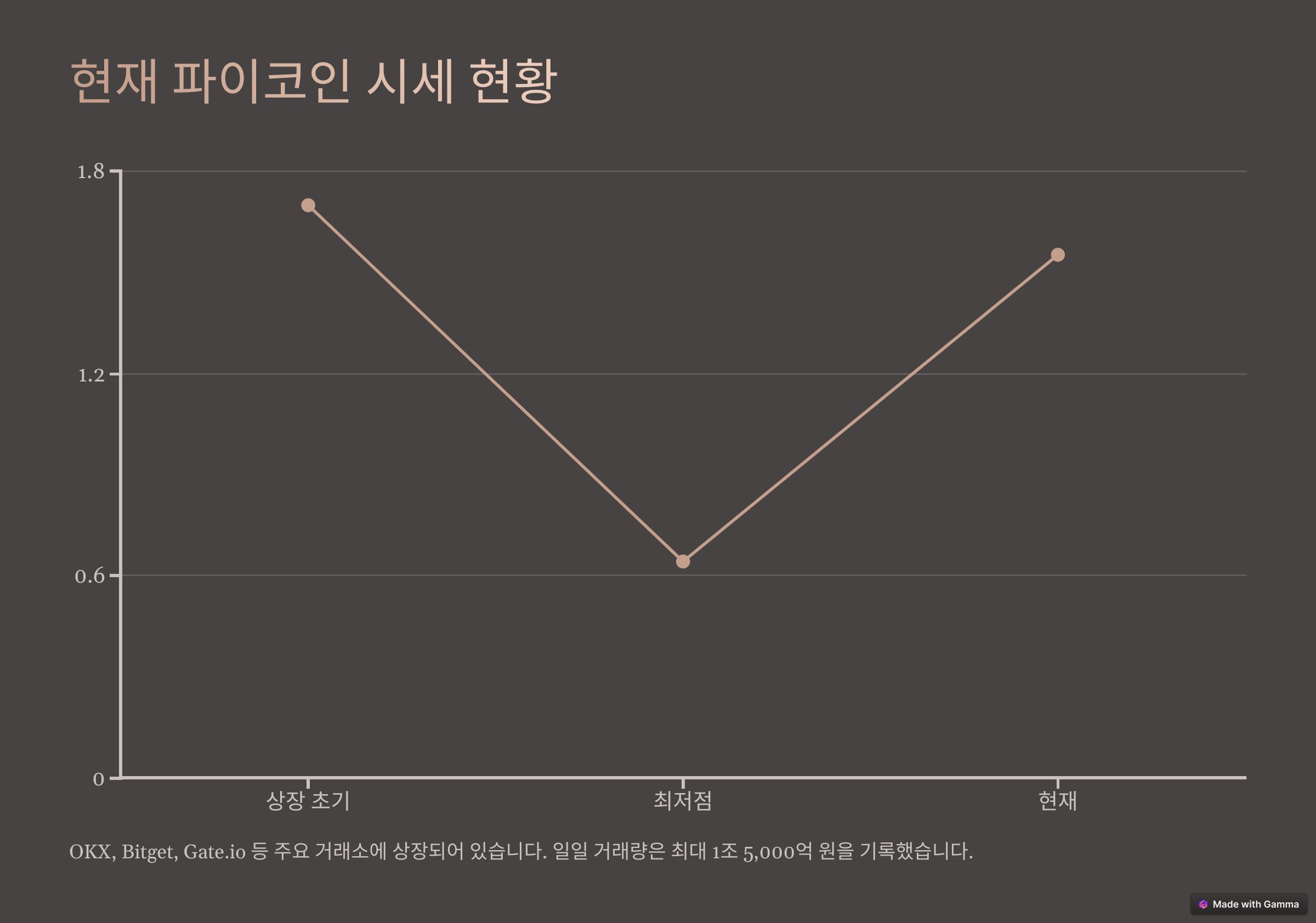 파이코인은 OKX, Bitget, Gate.io 등 주요 거래소에 상장되어 있으며, 상장 초기에는 1.70달러에서 시작하여 최저 0.64달러까지 하락한 후, 현재는 1.5~1.6달러 대에서 안정적인 흐름을 보이고 있습니다.