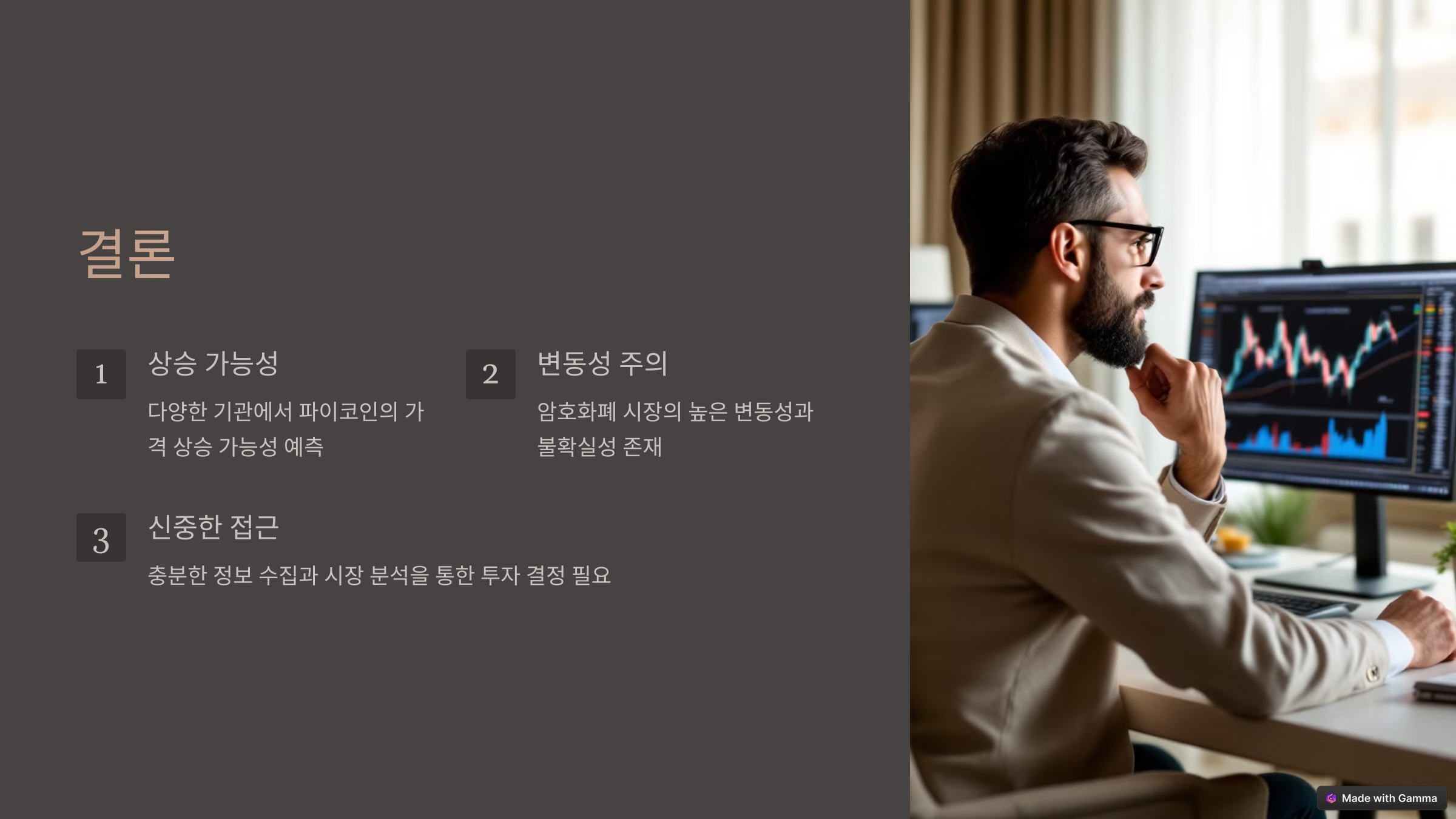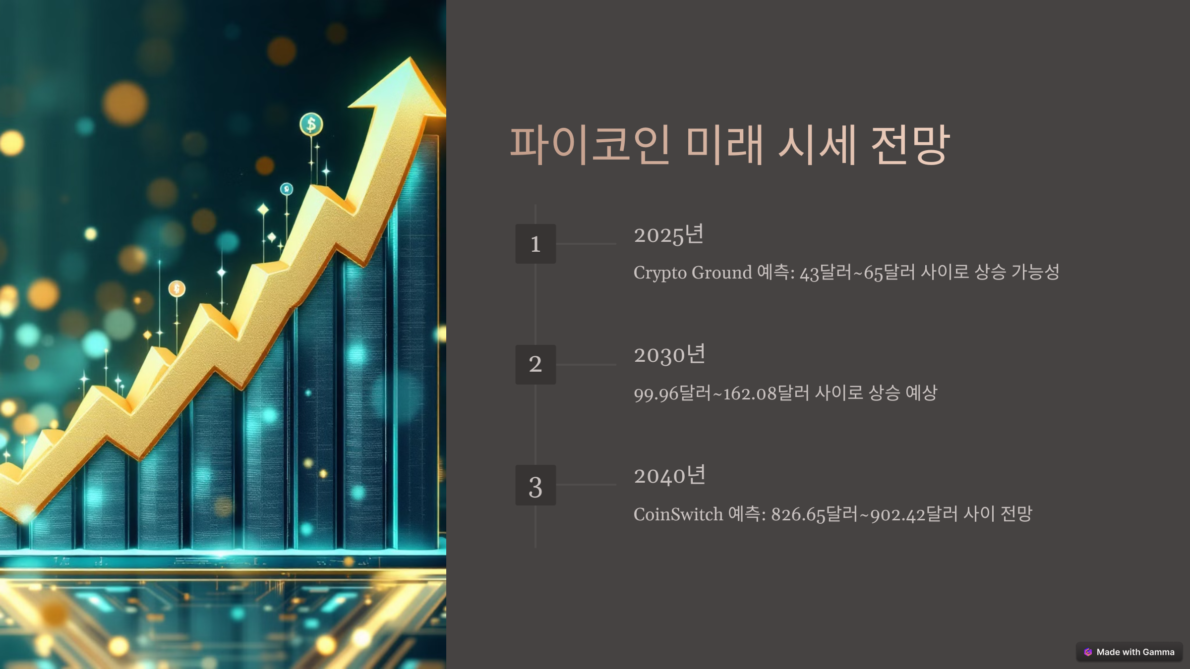 파이코인은 독특한 채굴 방식과 빠른 사용자 증가로 주목받고 있는 암호화폐입니다. 다양한 전망 기관들은 향후 파이코인의 가격 상승 가능성을 예측하고 있으나, 암호화폐 시장의 특성상 높은 변동성과 불확실성이 존재합니다.