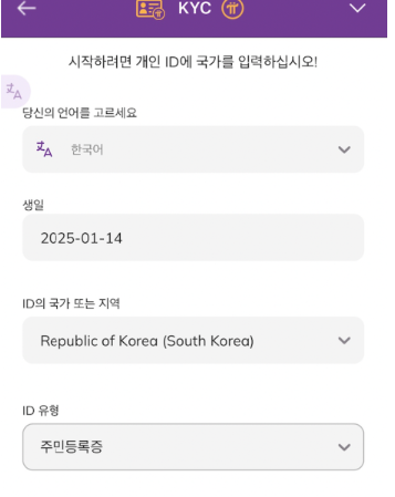 - KYC 신청 페이지에서 언어, 생년월일, 국가, 신분증 유형을 입력합니다.