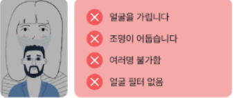 - 안경, 모자 등 얼굴을 가릴 수 있는 물건은 착용하지 않습니다.