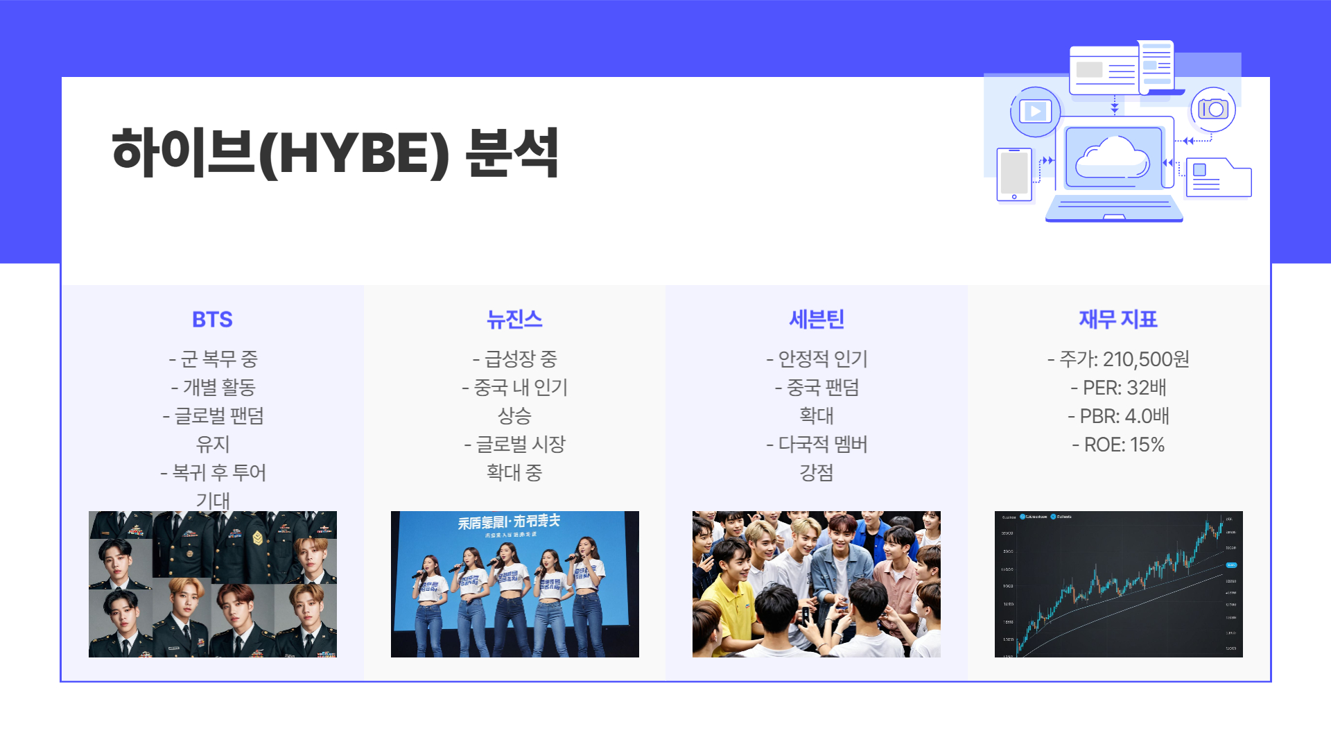 | 하이브 (HYBE) | BTS, 뉴진스, 세븐틴, 르세라핌 | ★★★★☆ (BTS 군백기, 뉴진스 성장 기대) | 210,500원 | 32배 | 4.0배 | 15% |