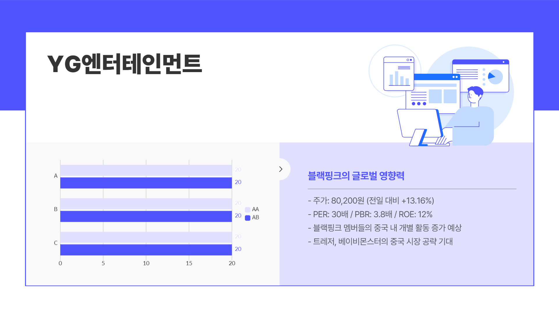 | YG엔터테인먼트 | 블랙핑크, 트레저 | ★★★★☆ (블랙핑크 인기 유지) | 80,200원 | 30배 | 3.8배 | 12% |