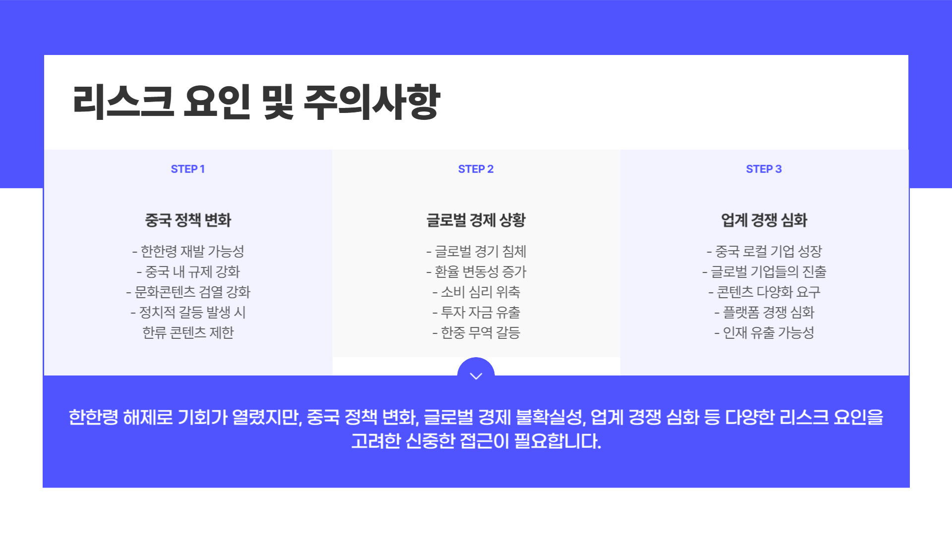 따라서 한한령 해제 관련주에 투자할 때는 단순한 기대감이 아니라, 각 기업이 가진 경쟁력과 시장 상황을 신중하게 분석한 후 결정하는 것이 중요하다.