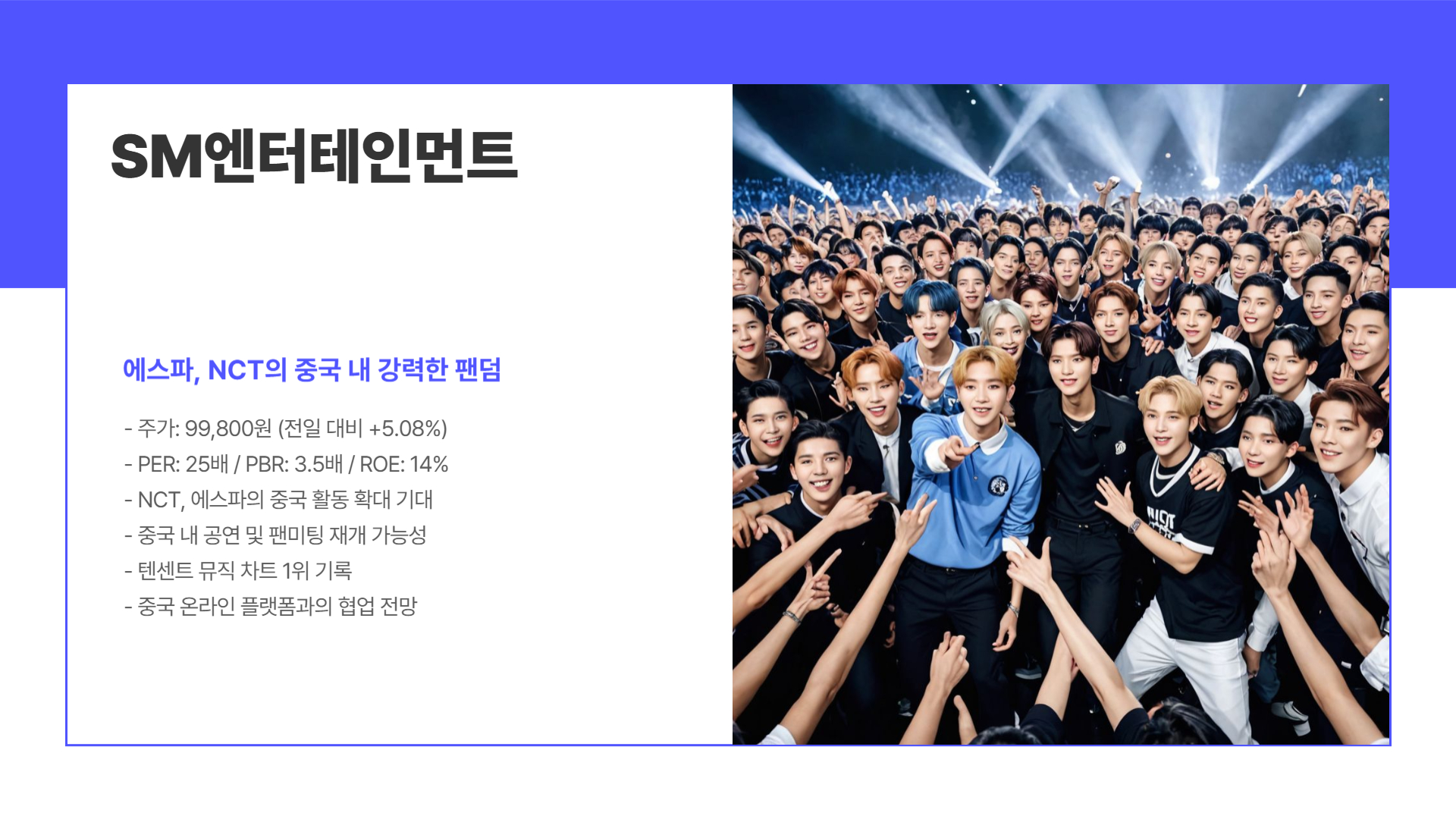 | SM엔터테인먼트 | NCT, 에스파, 동방신기 | ★★★★★ (에스파, NCT 인기) | 99,800원 | 25배 | 3.5배 | 14% |