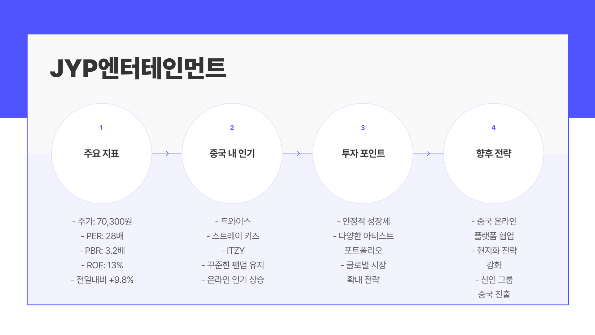 | JYP엔터테인먼트 | 트와이스, 스트레이 키즈, ITZY | ★★★★☆ (트와이스 중국 내 인기 꾸준) | 70,300원 | 28배 | 3.2배 | 13% |