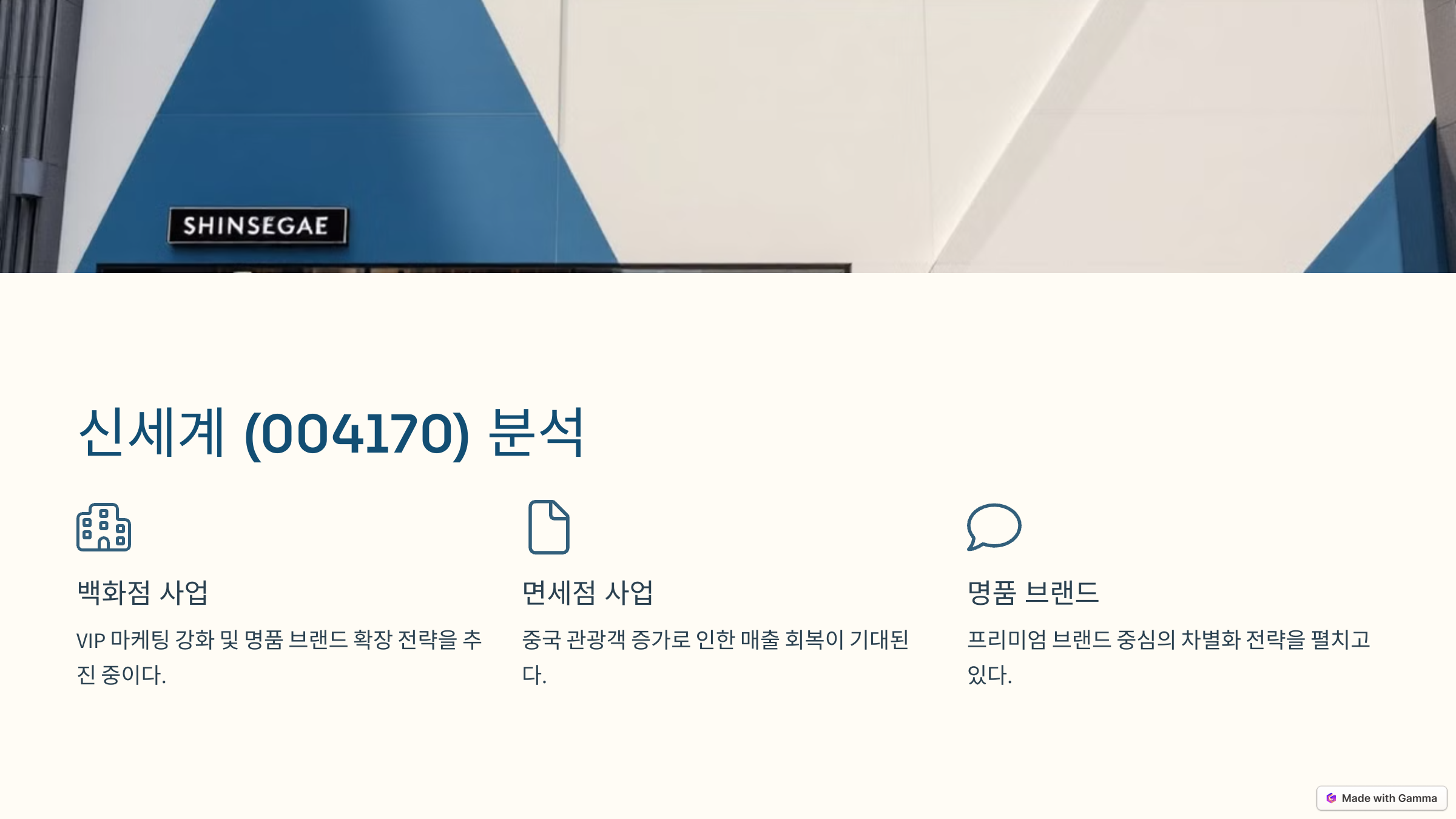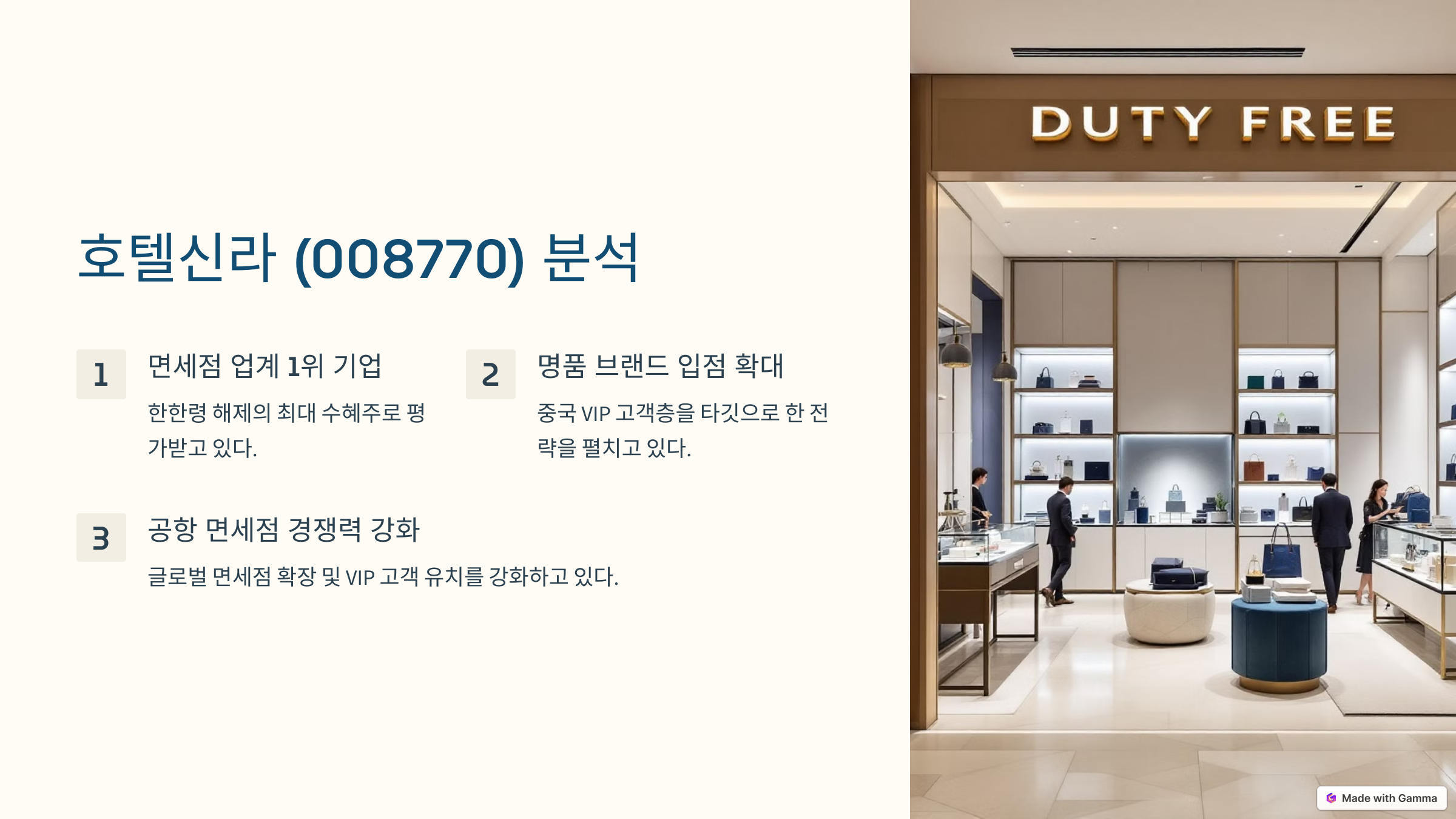 면세점 업계 1위 기업으로, 한한령 해제의 최대 수혜주다. 신라면세점은 중국 VIP 고객층을 타깃으로 명품 브랜드 입점 확대와 공항 면세점 경쟁력 강화 전략을 펼치고 있다.