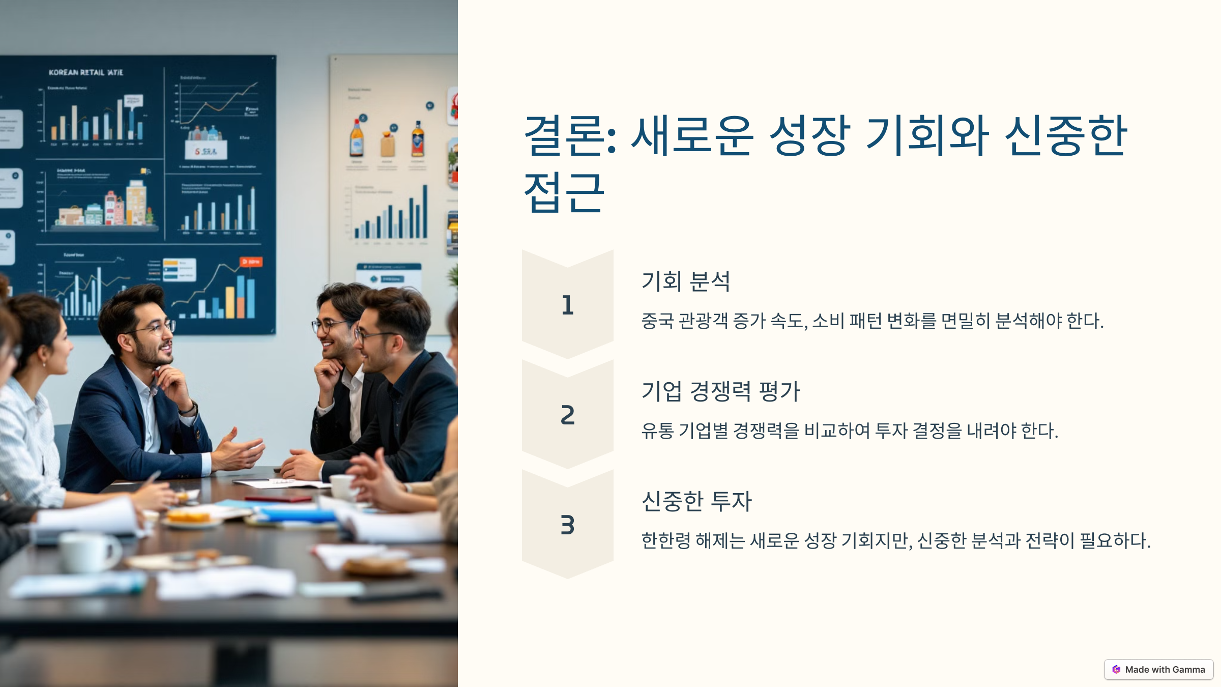 한한령 해제는 유통업계에 새로운 성장 기회를 제공할 가능성이 크다. 하지만 투자에 앞서 신중한 분석과 전략이 필요하다.