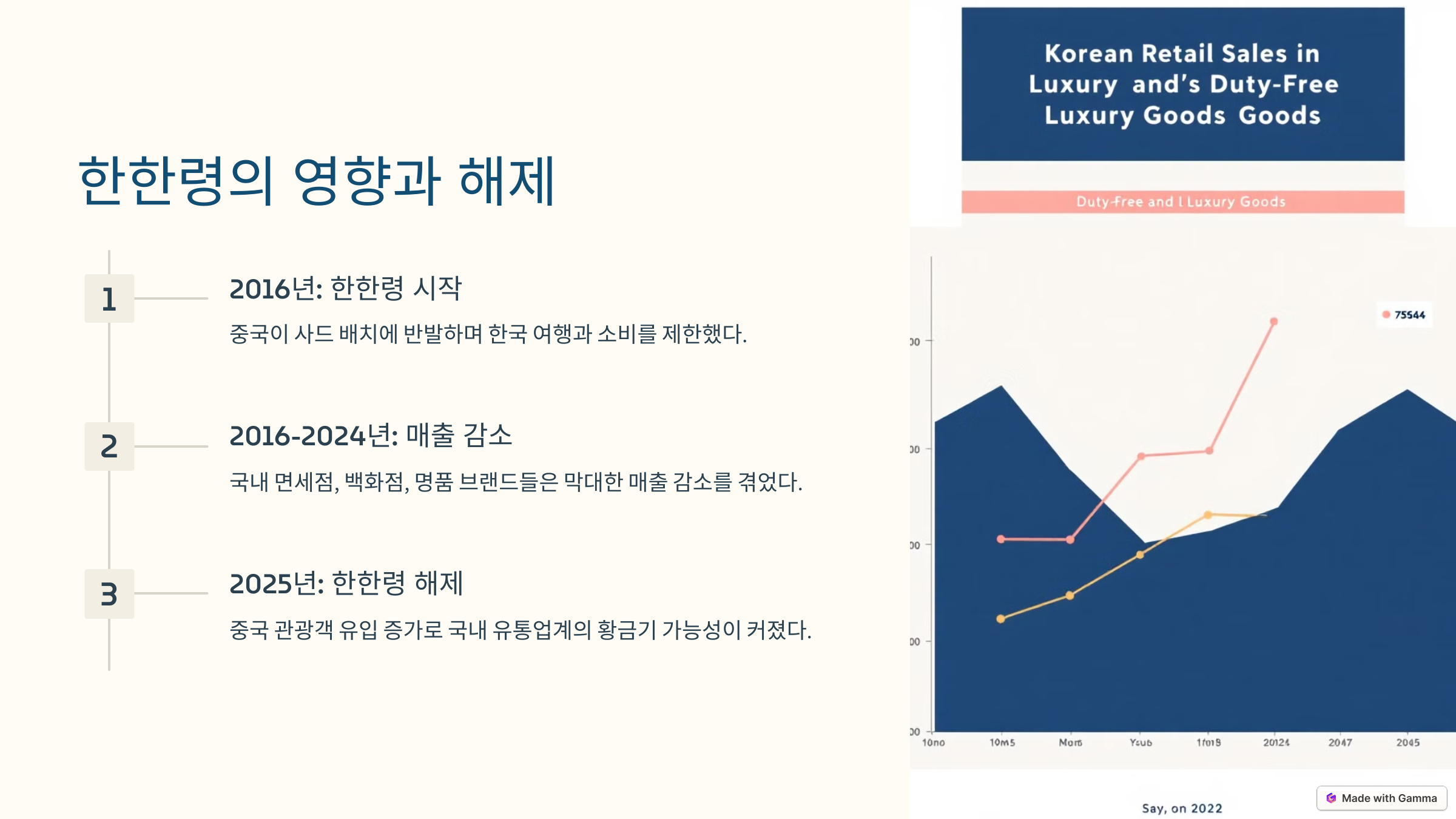2016년, 중국이 사드(THAAD) 배치에 반발하며 한국 여행과 소비를 제한한 이후 국내 면세점, 백화점, 명품 브랜드들은 막대한 매출 감소를 겪어야 했다.