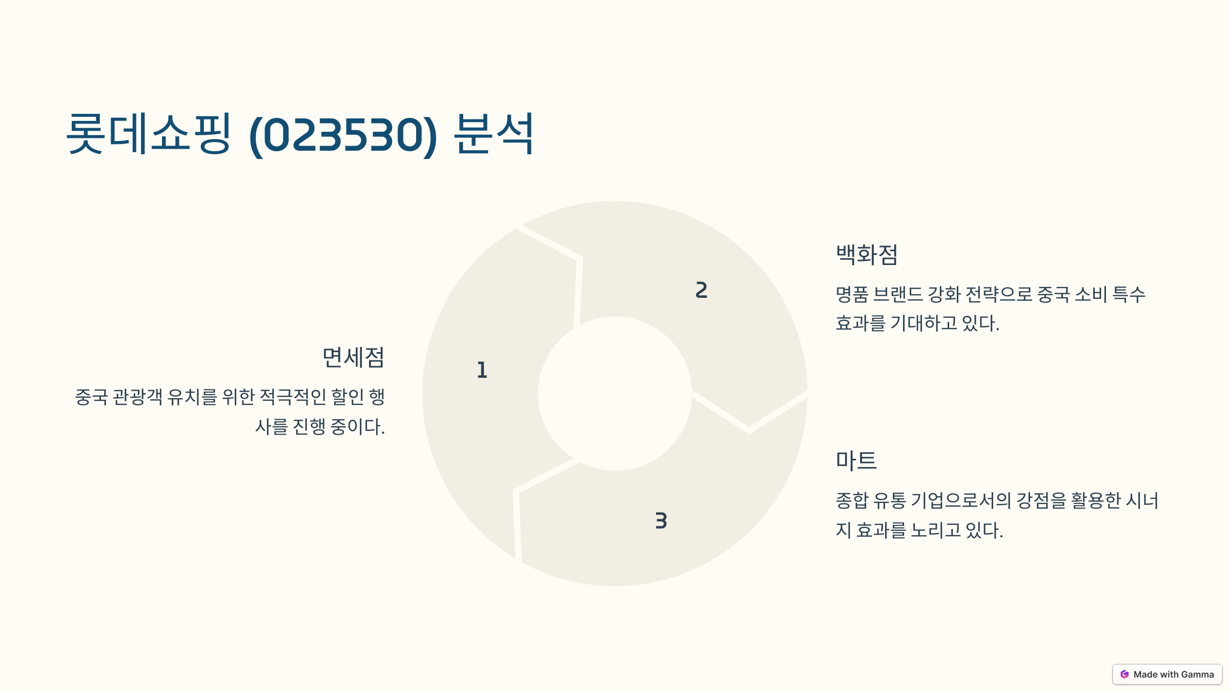 면세점, 백화점, 마트까지 보유한 종합 유통 기업이다. 롯데백화점과 롯데면세점은 중국 관광객 유치를 위한 적극적인 할인 행사 및 명품 브랜드 강화 전략을 펼치고 있다.