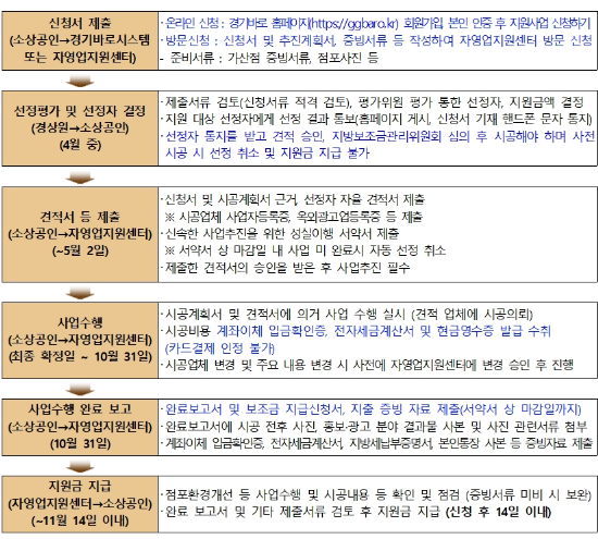 | 6. 개선 완료 후 정산 | 영수증 및 개선 후 사진 제출 → 증빙 자료 검토 후 지원금 지급 |