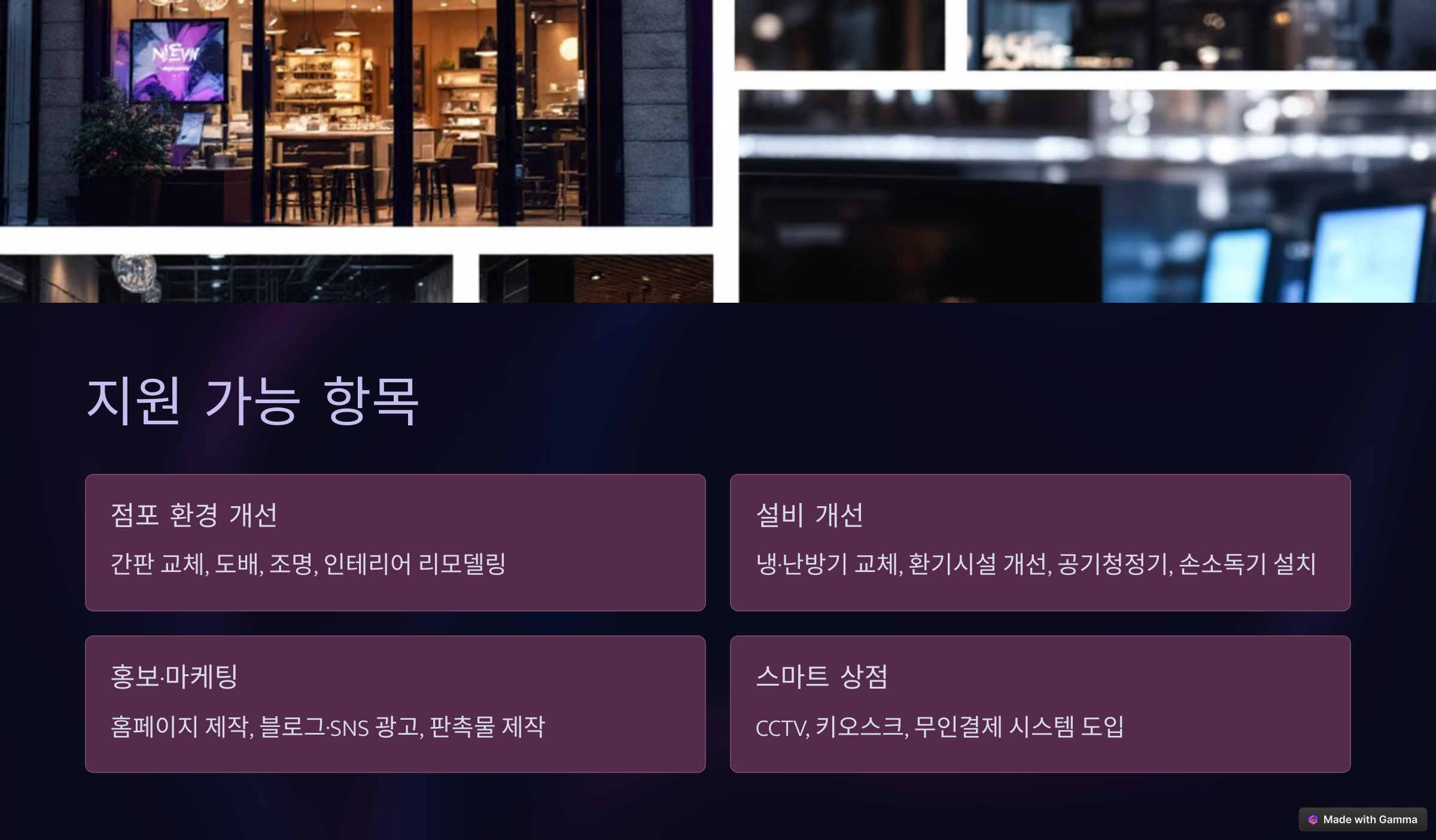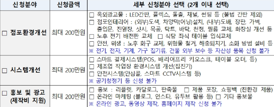 | 점포 환경 개선 | 간판 교체, 도배, 조명, 인테리어 리모델링 |