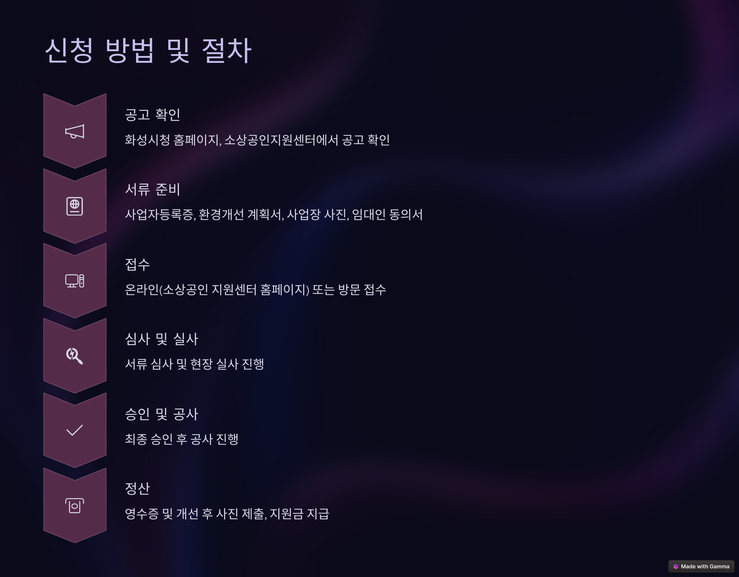 | 1. 공고 확인 | 화성시청 홈페이지, 소상공인지원센터에서 공고 확인 |