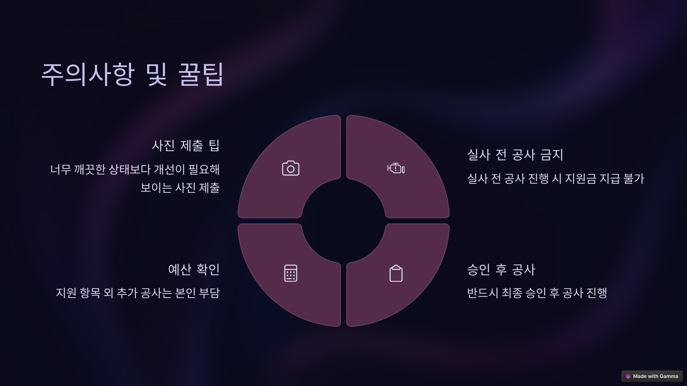 공사 진행 후에 지원금을 신청하면 승인되지 않음 - 지원 항목 외 추가 공사는 본인 부담
