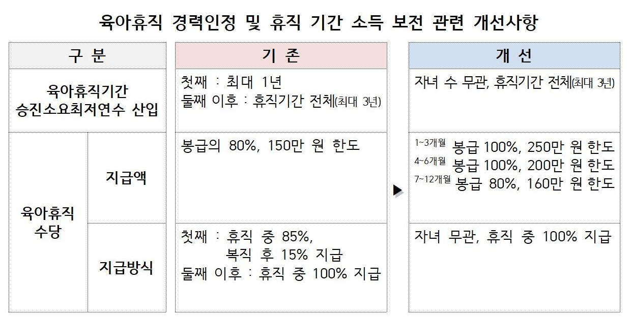 기존에는 첫째 자녀의 육아휴직 기간이 최대 1년까지만 승진에 필요한 경력으로 인정되었고, 둘째 자녀부터는 최대 3년이 인정되었습니다. 그러나 앞으로는 자녀의 수에 관계없이 모든 육아휴직 기간이 승진 경력으로 포함될 예정입니다. 이는 육아휴직을 한 공무원이 경력 상의 손해를 보지 않도록 도와주어, 출산을 기피하는 문제를 해소할 것으로 기대됩니다.