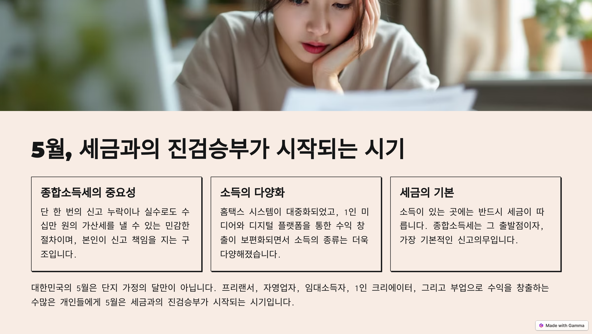 대한민국의 5월은 단지 가정의 달만이 아닙니다. 프리랜서, 자영업자, 임대소득자, 1인 크리에이터, 그리고 부업으로 수익을 창출하는 수많은 개인들에게 5월은 세금과의 진검승부가 시작되는 시기입니다. 바로 종합소득세 신고기간이 돌아오기 때문이죠.