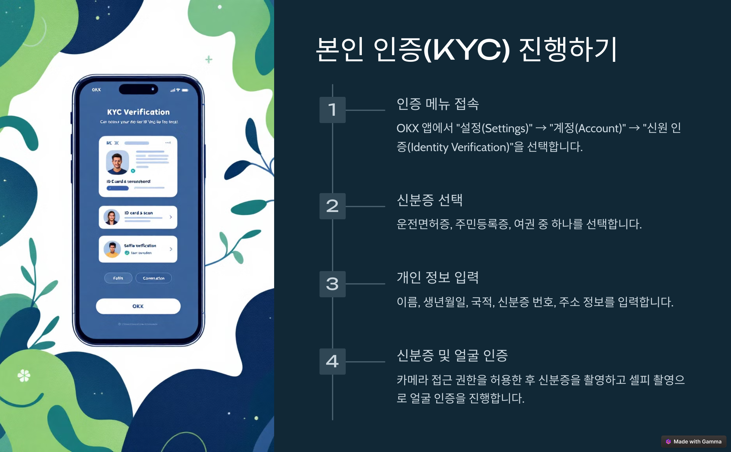 - OKX 앱에서 "설정(Settings)" → "계정(Account)" → "신원 인증(Identity Verification)" 선택