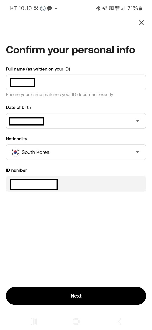 - 개인 정보 입력 (이름, 생년월일, 국적, 신분증 번호)